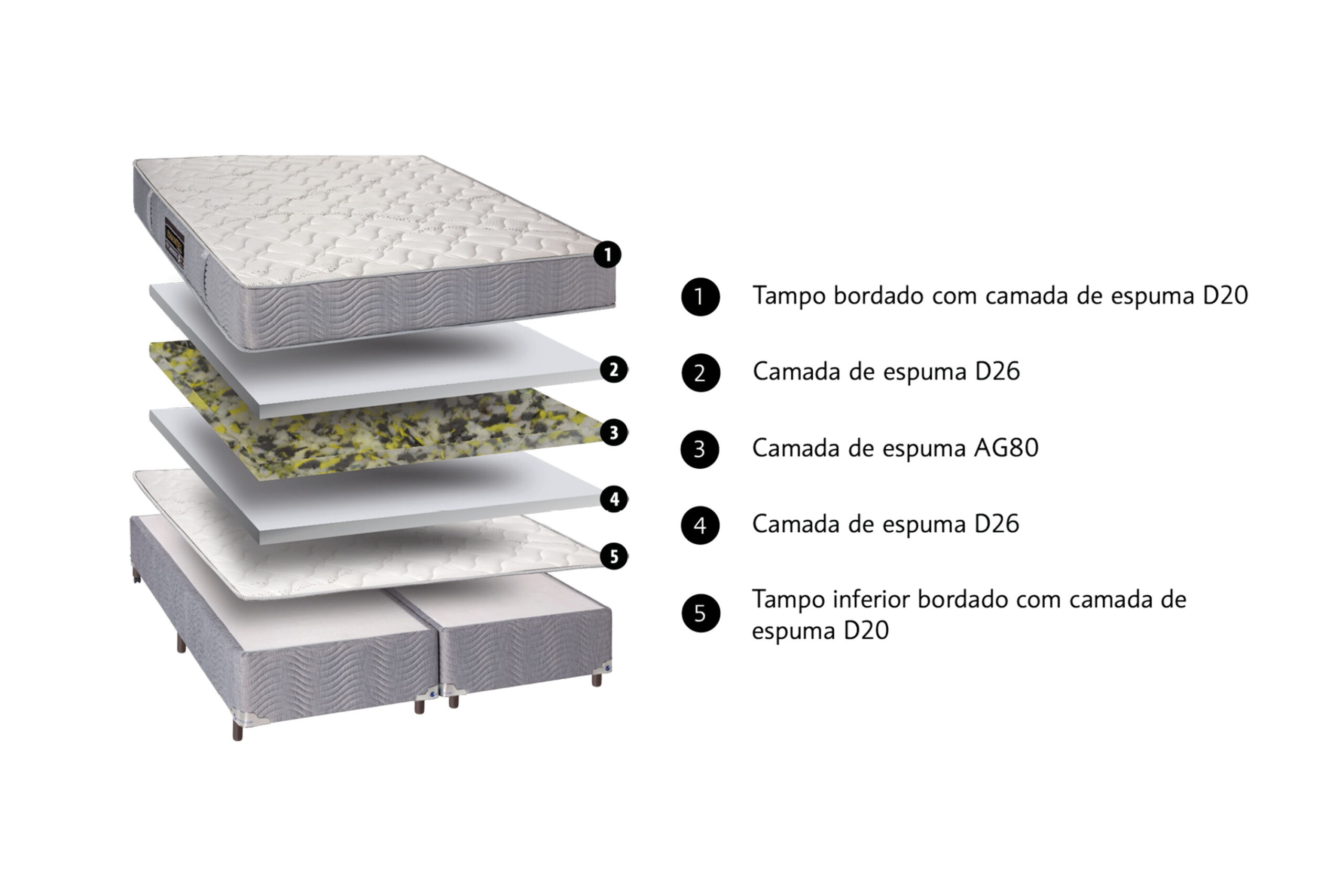 O colchão é construído com duas camadas de espumas D26 e uma AG80 entre elas para proporcionar um bem-estar único às suas noites.